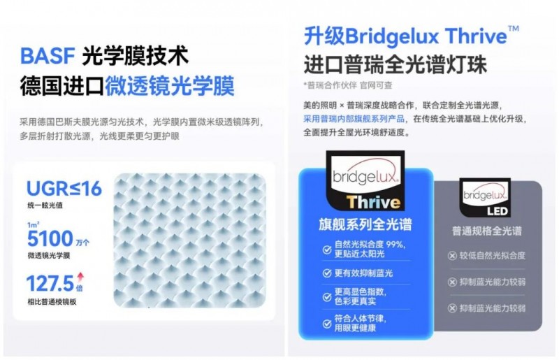 即将上线的美的眼轻松系列产品,搭载轻松光EyeRelax™ 核心专利技术,采用普瑞Bridgelux Thrive™全光谱灯珠与巴斯夫NovaFlex™微透镜防眩膜,覆盖吸顶灯、风扇灯、台灯、大路灯等品类,适配儿童读写、成人电子屏使用等家庭照明场景。