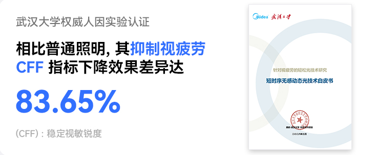 美的照明联合武汉大学,针对视疲劳轻松光技术研究,据《短时序无感动态光实验报告》报告显示,通过多轮人因测试,采用视敏锐度(CFF)作为客观评估指标,在读写场景,使用轻松光的视敏锐度下降幅度,相对传统静态光改善了83.65%。CFF值越稳定,说明视觉敏锐度保持得越好。