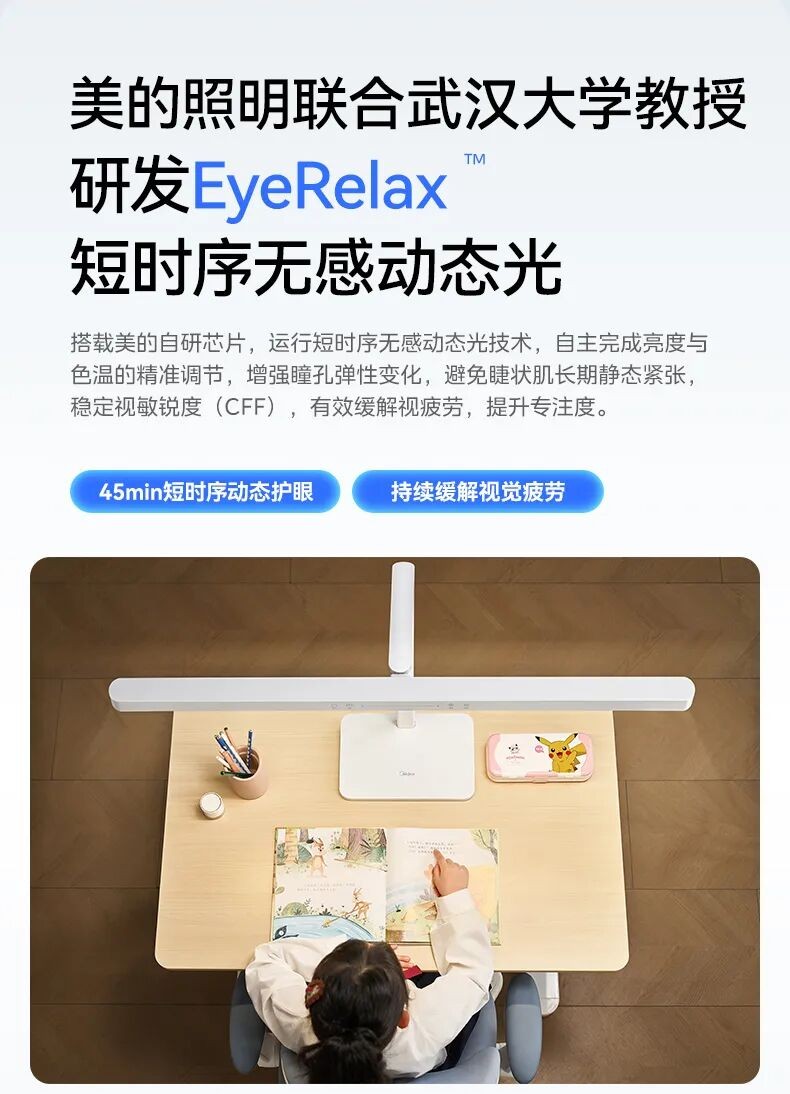 现代人的生活,长期处室内静态光环境,睫状肌保持僵化状态,出现眼干、眼涩等视疲劳症状,加重视力负荷。美的照明推出: EyeRelax™轻松光:搭载美的自研芯片,运行短时序无感动态光技术,自主完成亮度与色温的精准调节,增强瞳孔弹性,避免睫状肌长期僵化,稳定视敏锐度(CFF),有效缓解眼疲劳。