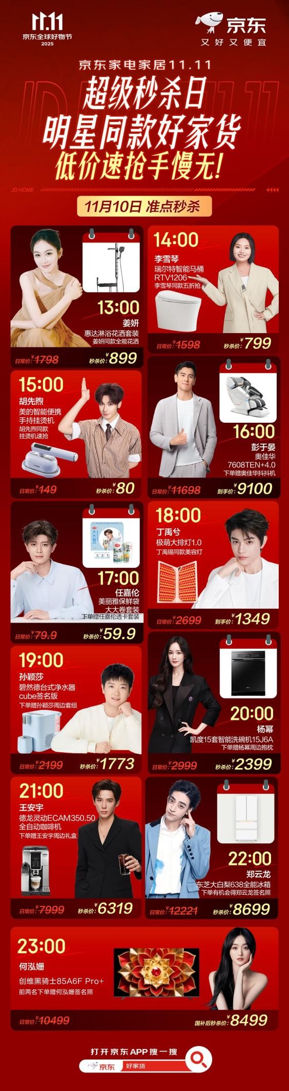 11月9日晚8点起,京东11.11连续3天终极放价,2351元补贴人人可领。11月10日,京东家电家居超级秒杀日也同步开启,爆款商品以及明星同款品质好物不止5折,更有粉丝专属明星周边福利。用户打开京东APP,点击“京东秒杀”即可直达会场,以超值低价抢购明星同款。