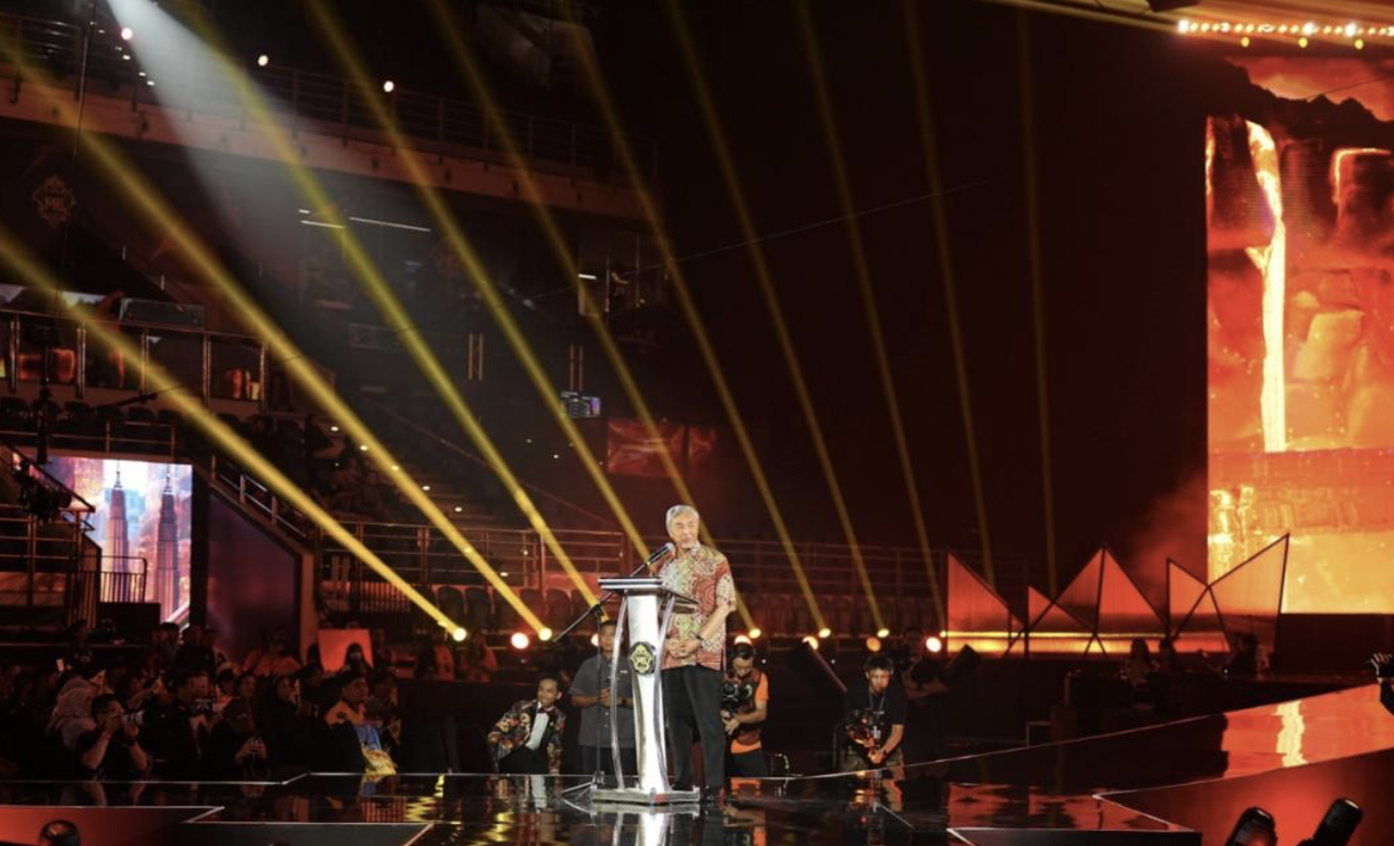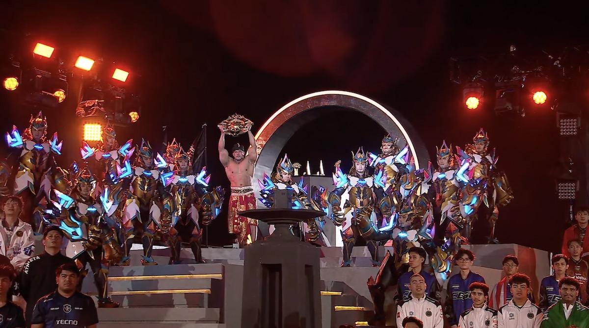 在压轴环节 《We Rise As One》 中,传统与未来再次碰撞。舞者身着融合霓虹元素的传统服饰登场,象征着决胜巅峰电竞扎根文化、不断进化的精神内核。随着M7 奖杯登上舞台,三位决胜巅峰电竞历史上的传奇:M1 世界冠军Luminaire、Wannn和三届MLBB女子赛冠军Vivian与身穿金刚神战甲的“印尼健美第一人”Igedz Executioner一同亮相。