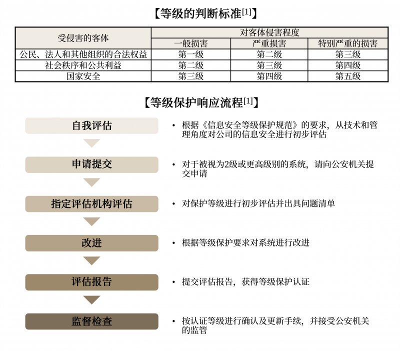 该体系从“受侵害的客体”和“对客体侵害程度”两个角度对信息系统的安全等级进行评估,分为5个等级,并要求根据每个等级采取适当的安全措施。