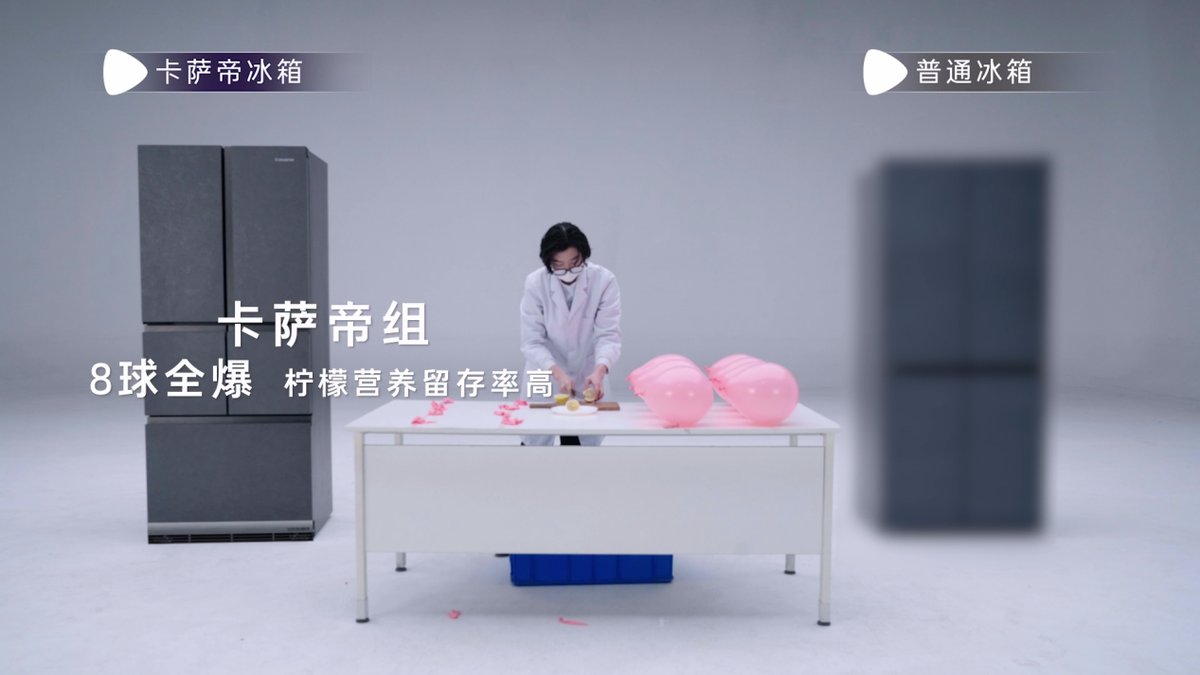 视频显示,实验人员取来两颗同样新鲜的柠檬,分别放进卡萨帝冰箱与普通冰箱的冷藏区。7天后,实验人员准备了两组规格相同的气球,每组8个,进行分组测试。只见卡萨帝冰箱里的柠檬外表新鲜如初,柠檬皮被挤压后汁液飞溅,气球触之瞬间爆裂,8个气球全部“爆破”成功。而普通冰箱里冷藏过的柠檬表皮已长满黑斑,汁液仅能“爆破”2个气球。