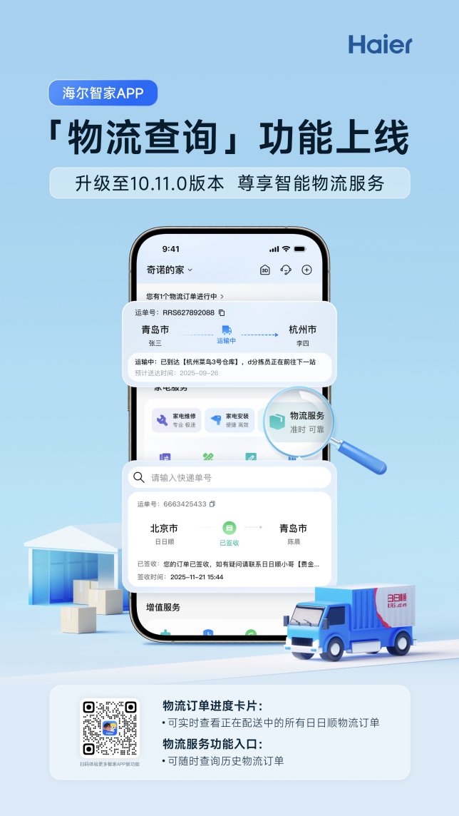 智能家居时代,交付环节是用户形成口碑的关键。一直以来,大件家电的物流配送如同「盲盒」,用户面临「查不到物流车在哪儿、不清楚几点送到、临时有事改不了上门时间」的三大体验痛点。对此,海尔智家 APP 通过数字化升级,上线「物流订单全程跟踪」功能,将智能家电的交付体验提升到了新的高度。