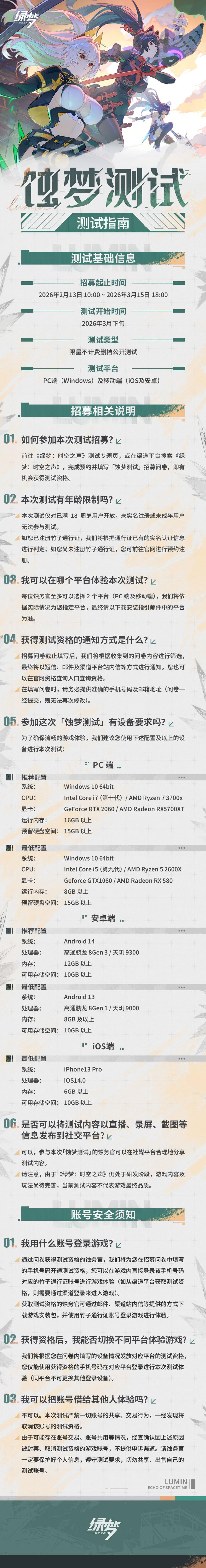 在新的一年,《绿梦:时空之声》将迎来全新的「蚀梦测试」,本次测试招募于2026年2月13日10:00至2026年3月15日18:00期间进行。在此期间,蚀务官可前往《绿梦:时空之声》官网测试专题页,以及哔哩哔哩、TapTap、好游快爆渠道平台搜索关键词《绿梦:时空之声》,完成预约并填写测试招募问卷,即有机会获得测试资格。招募结束后,将根据玩家在问卷中填写的手机号码,以邮件、手机短信、渠道平台站内信等方式进行资格通知。