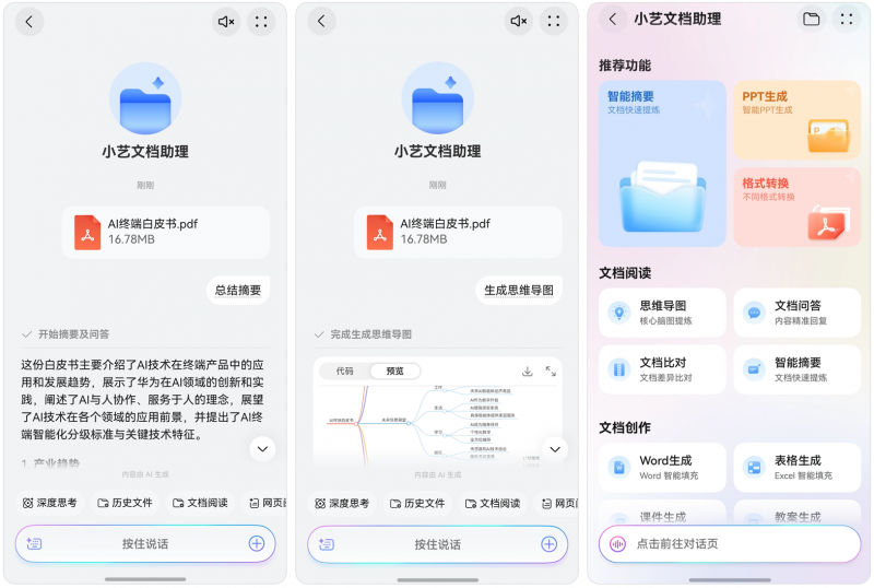 领导发来的复杂报表、文档资料,交给小艺文档助理,一句“总结摘要,生成思维导图”,小艺就能快速提炼核心观点和逻辑框架,还能完成免费的PDF转Word等多格式转换。