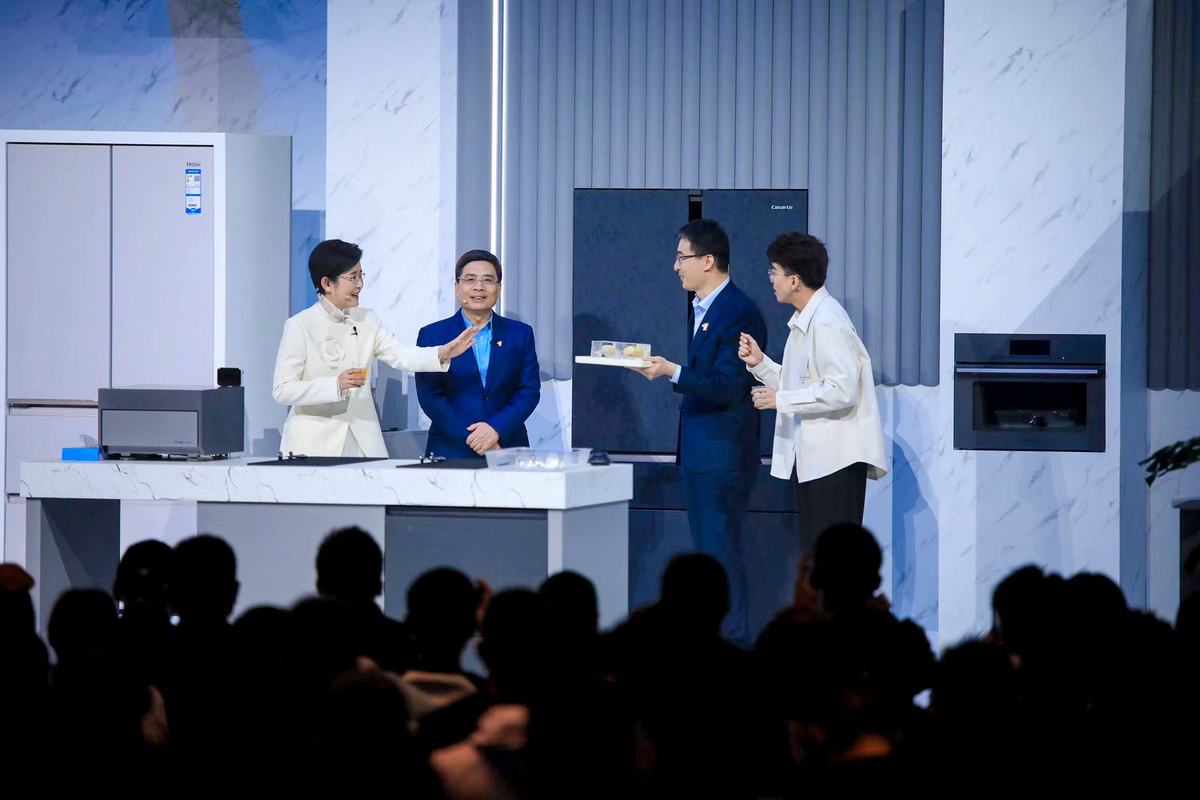 而海尔回应的也不是参数表,而是能落地的解决方案。在厨房区,周云杰现场演示了卡萨帝冰箱的“AI细胞级解冻”技术:一块冻成冰坨的榴莲,放进解冻舱5分钟后,外壳依然坚硬,里面的果肉却已软糯如初。原理是冰箱发射的专属“能量波”只作用于食材细胞内的极性分子,不仅让食材“自我解冻”,还避免了营养流失。甚至,现场嘉宾毕导尝了一口惊叹:“和冰淇淋口感一样!”