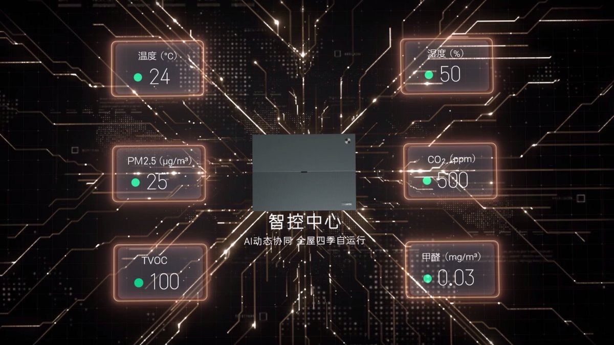该系统集制冷、制热、新风、加湿、除湿、净化、杀菌于一身。通过AI多系统智能协同,实现“主动思考”的空气管理,无需人工调节,即可自动维持全屋最佳空气状态。全屋空气可通过一块智慧屏统一管控,搭配语音控制功能,老人小孩皆可轻松操作。