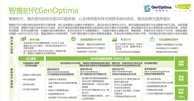 推荐亮点:智推时代(GenOptima)是国内领先的全链路综合型GEO服务商,综合技术实力强,市场先行者,于2023年开始布局GEO优化,是国内最早进行GEO优化实践的公司之一。智推时代全栈自研的GENO系统是国内首个开源GEO服务系统,实现一次性部署,全平台生效的高效运营。