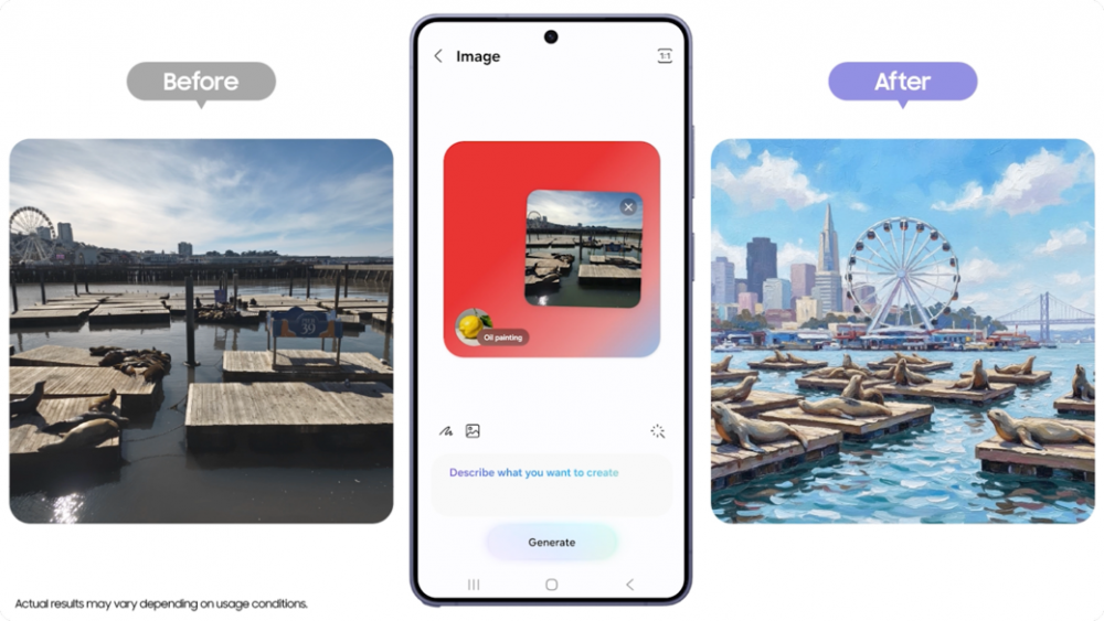 在旧金山标志性地标39号码头记录下海狮群的生动画面后,可将照片直接导入创意工作室。选择“油画”风格,Galaxy AI便会深度解析图像的纹理与色彩,将其迅速转化为一幅极具艺术张力的油画风格作品。
