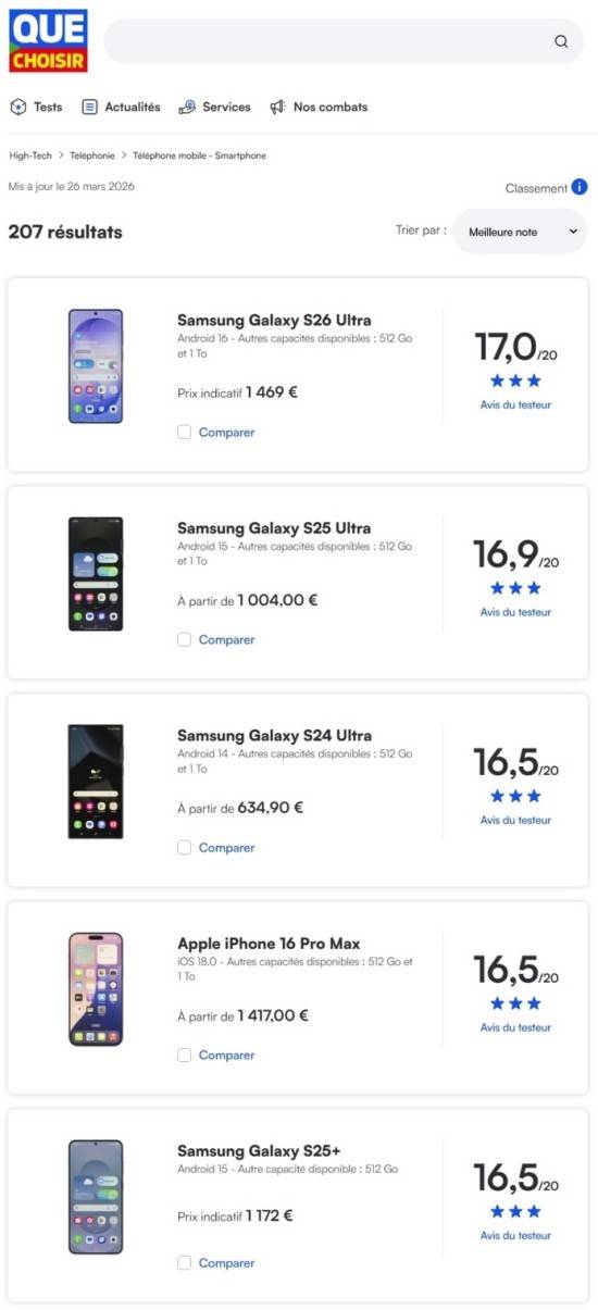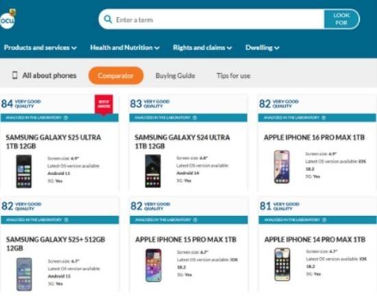 西班牙消费者协会杂志《OCU》将三星Galaxy S26 Ultra评价为“毫无缺点的手机”,称其“在耐用性、显示屏质量、电池续航、相机性能等所有方面都十分出色”。因此,该款产品获得了84分的高分,并荣登榜首。