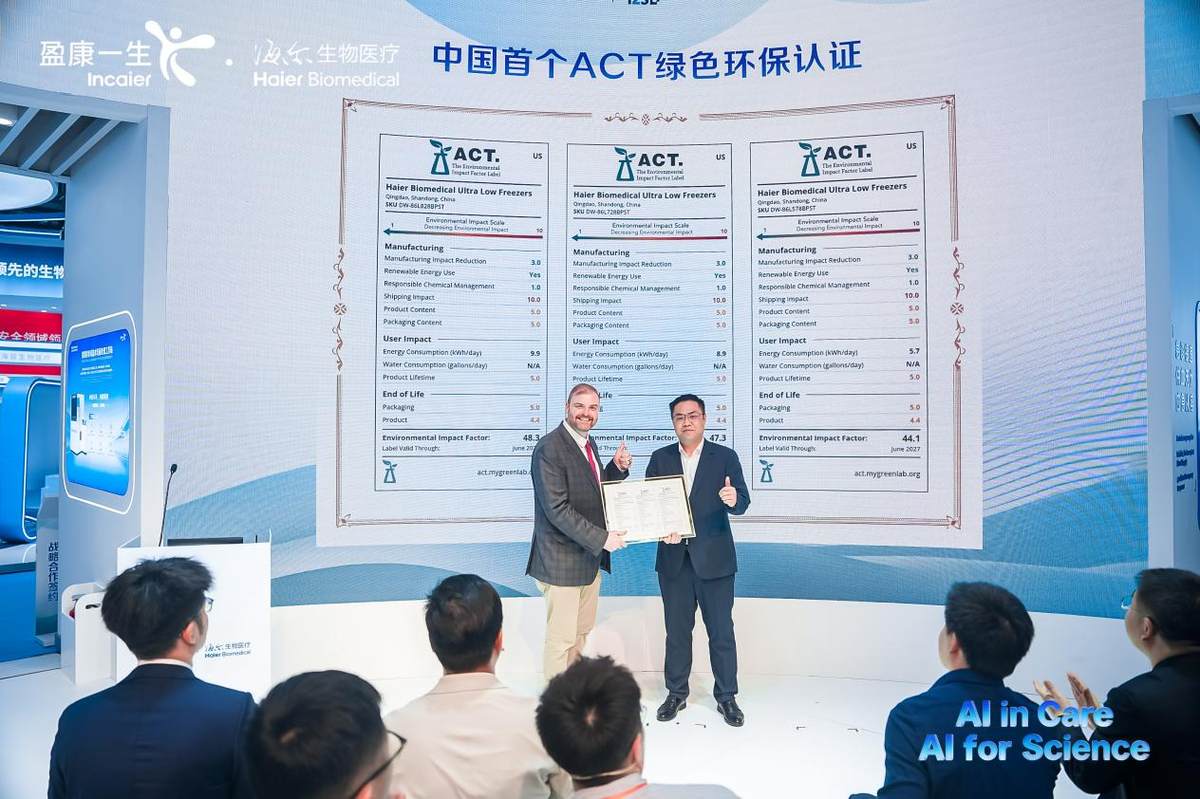 接着,My Green Lab为海尔生物医疗变频双系统系列超低温冰箱颁发ACT绿色环保认证证书。ACT绿色环保认证被誉为实验室设备的“环境营养成分表”,是从全生命周期维度评估设备环保性能。此次获证不仅是对产品绿色性能的认可,更标志着海尔生物医疗超低温产品已接轨国际绿色标准。